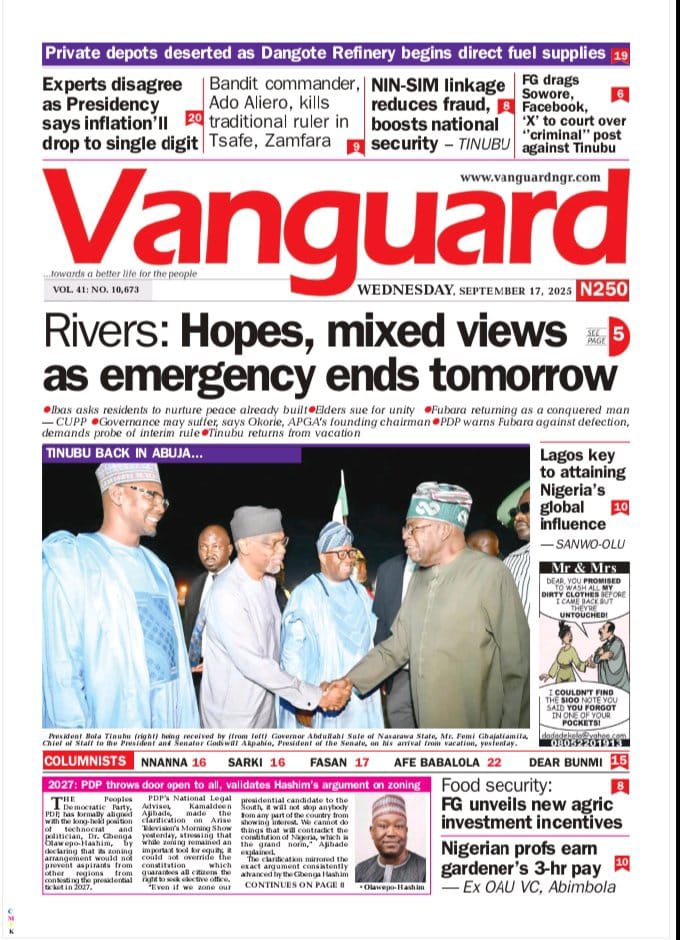 The dailies dwell on the expiration of the Rivers emergency rule as Siminalayi Fubara prepares to return as governor of the state.
