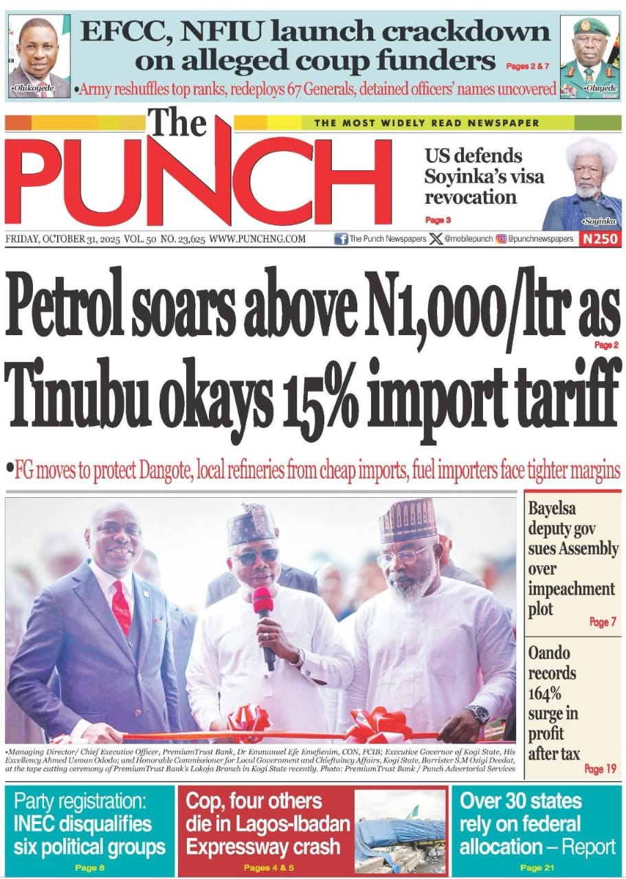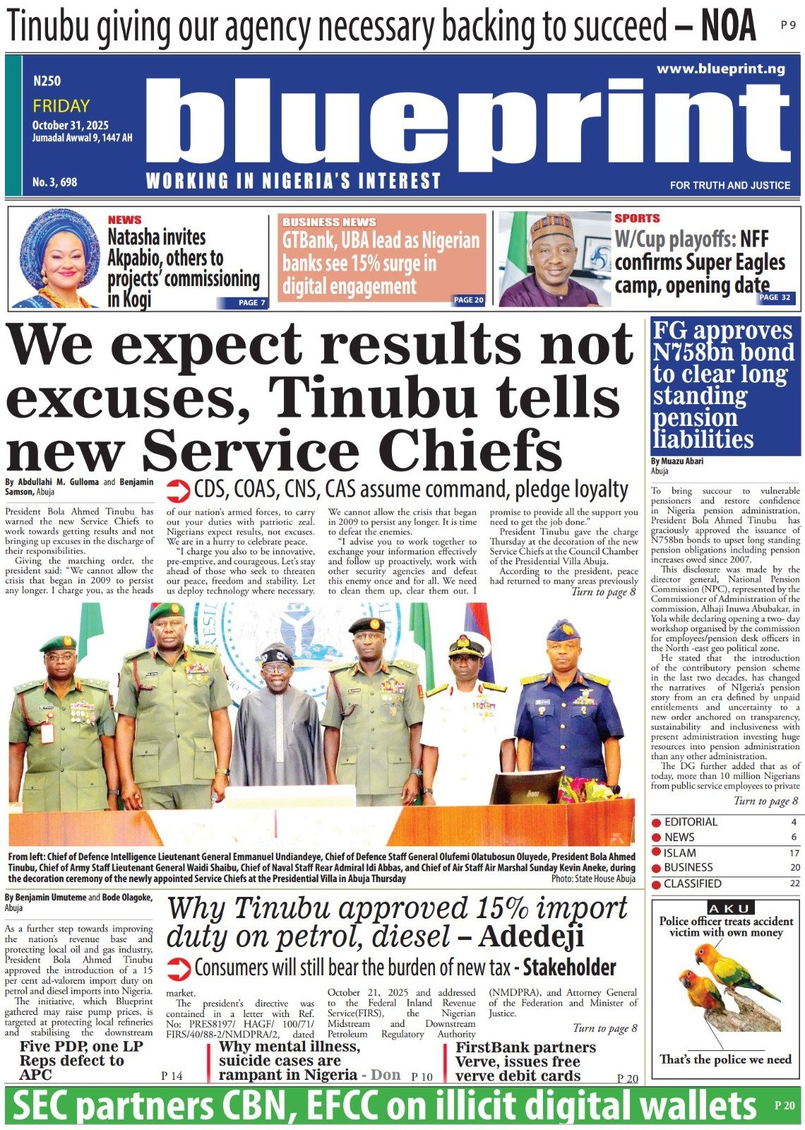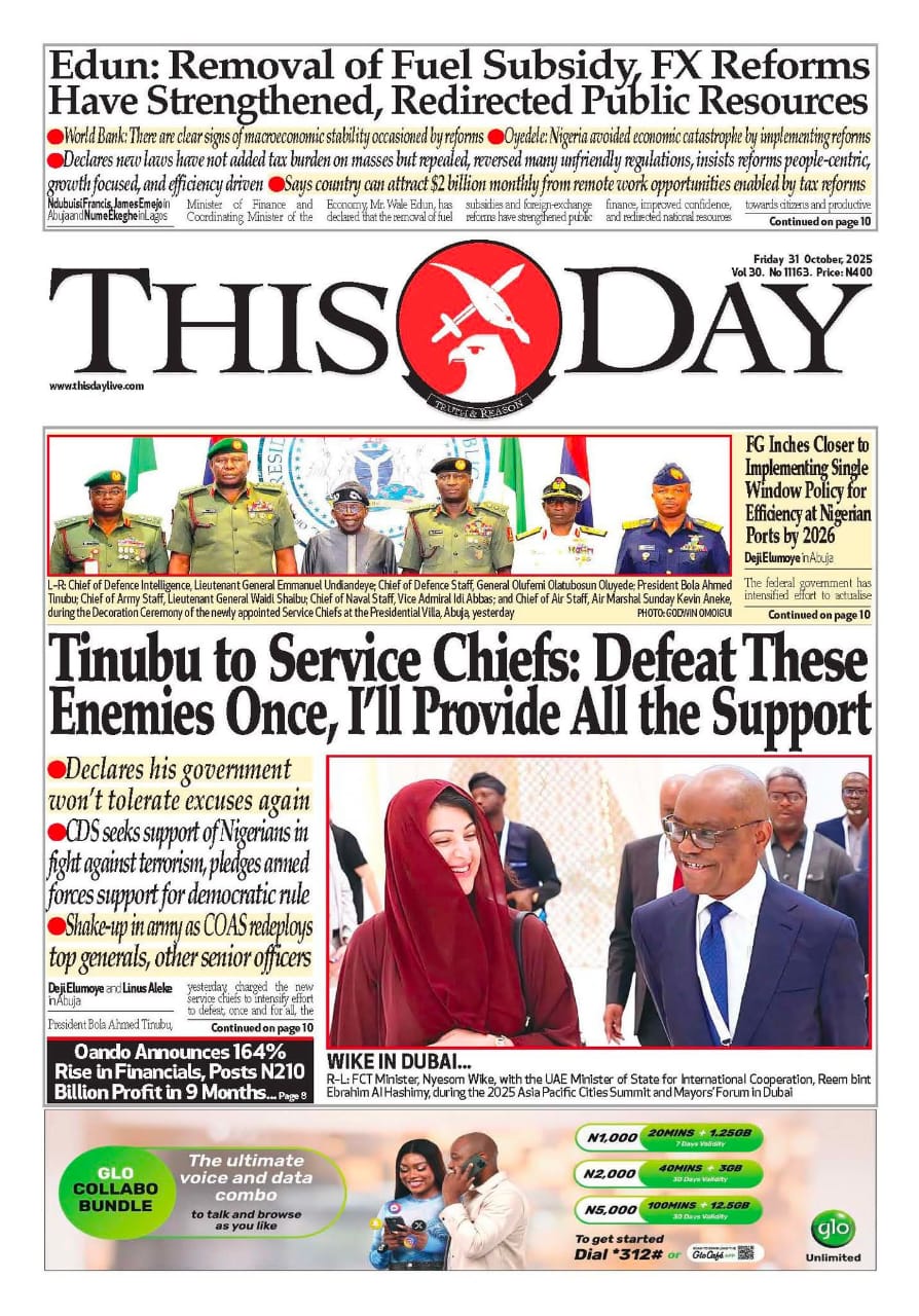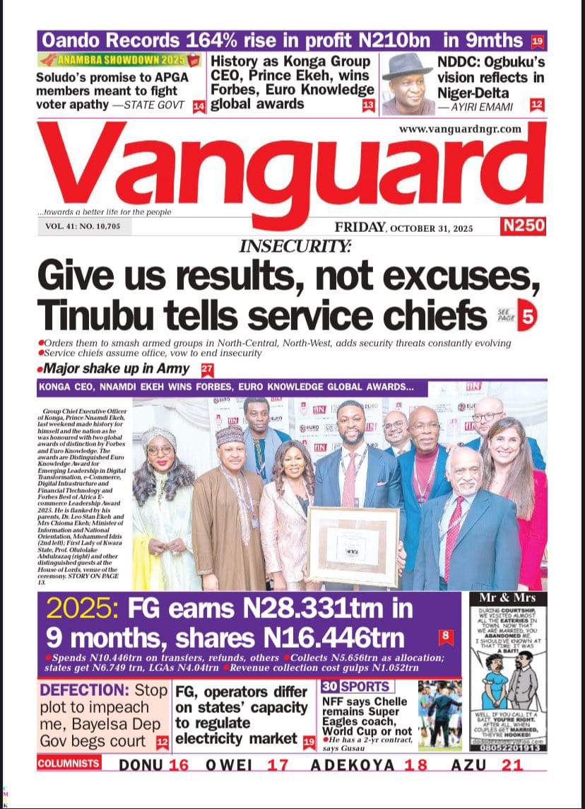 The admonition of President Bola Tinubu to the newly appointed service chiefs, and the foiled coup plot, permeate the cover pages of today’s dailies.