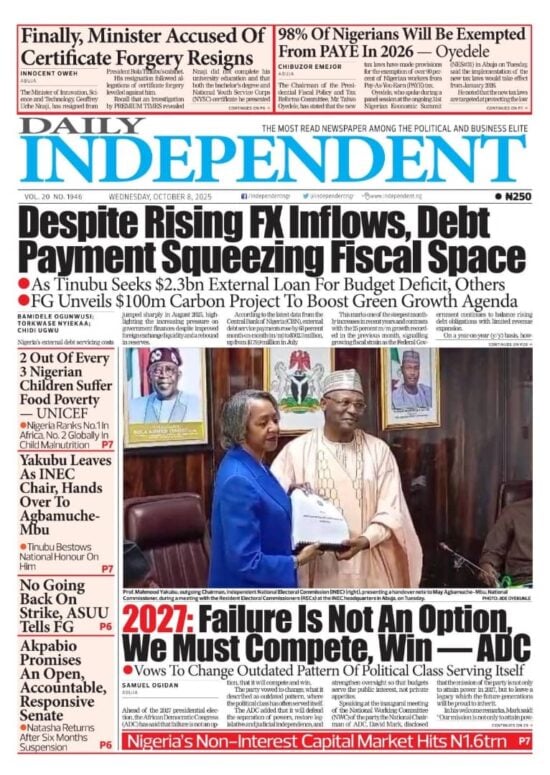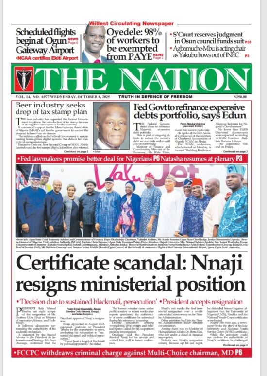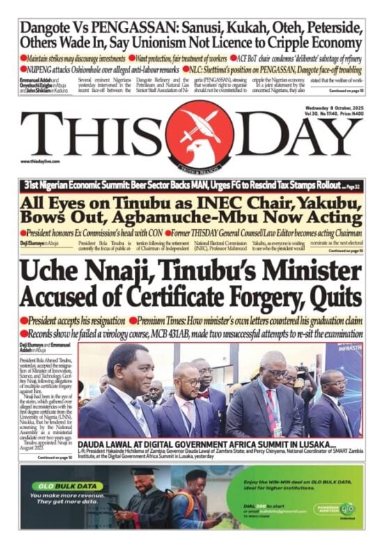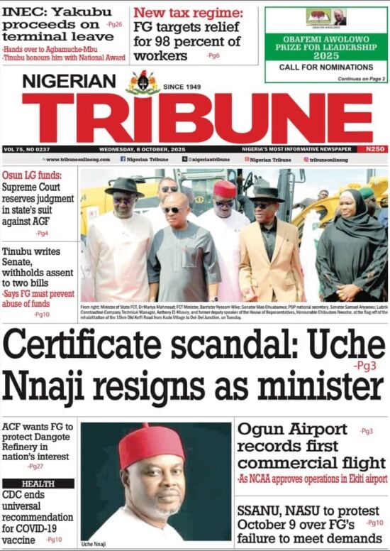 Reports on the resignation of Uche Nnaji from President Bola Tinubu’s cabinet, amid controversies over his academic records and allegations of certificate forgery, perfuse the cover pages of today’s dailies.