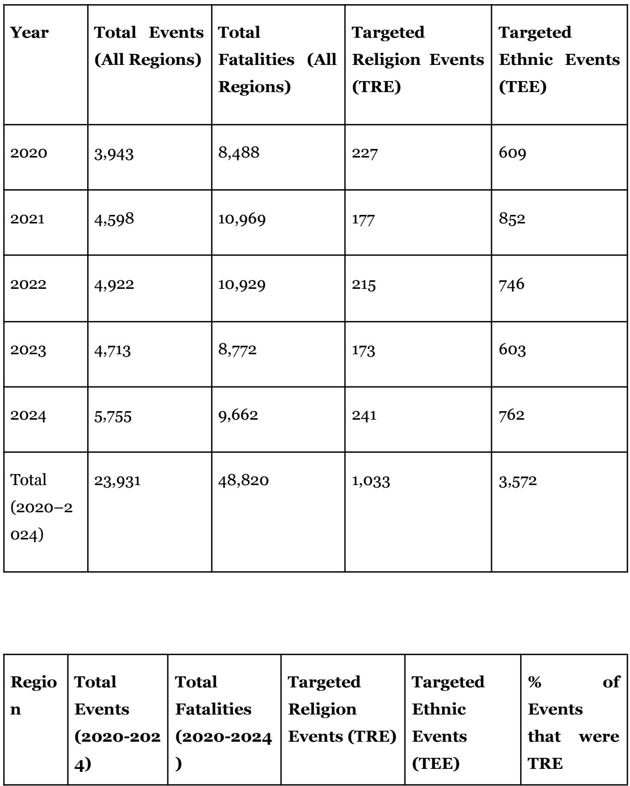 Across the five years (2020–2024), 1,033 total events were flagged as targeting a religious group. This is in contrast to the total of 23,931 conflict events.