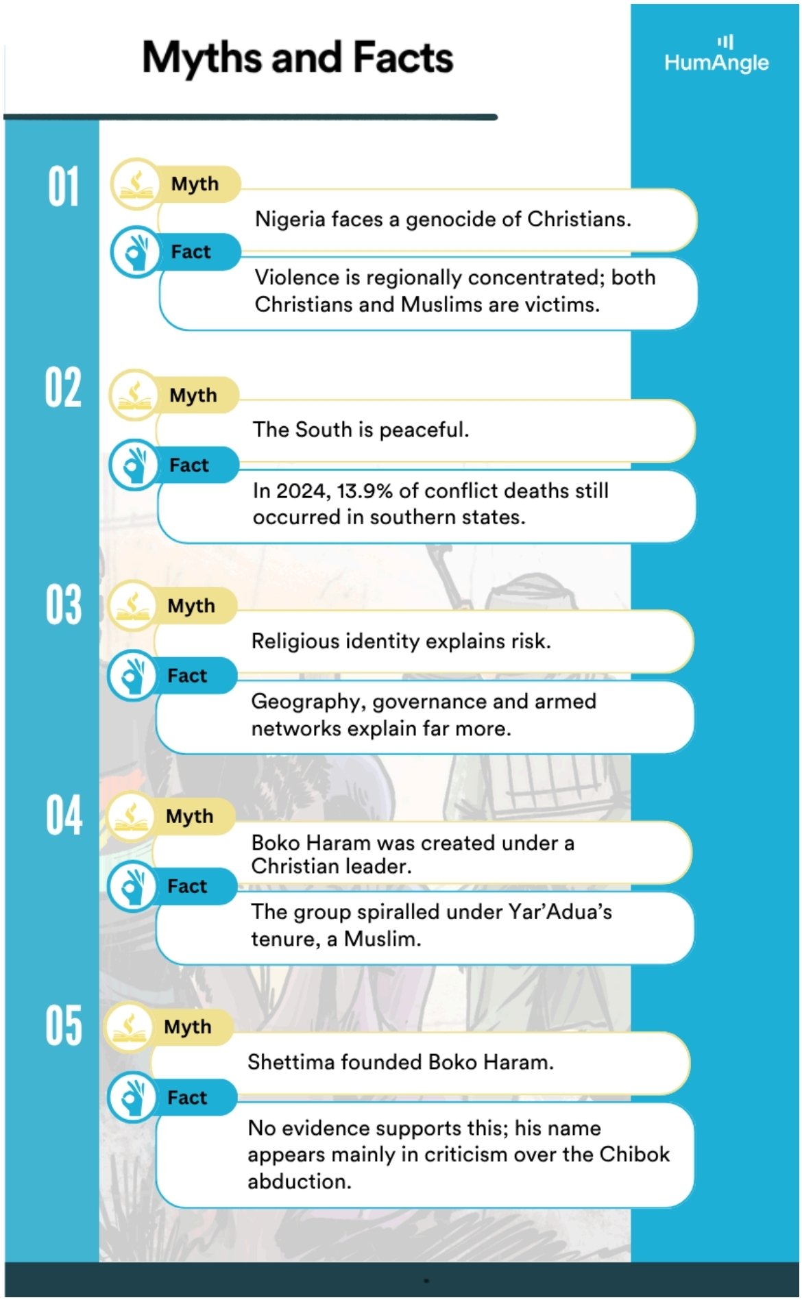 Years of reporting by HumAngle, which includes fact-checks, investigations, and data analysis, consistently demonstrate that we cannot neatly box Nigeria’s insecurity as a religious war. Instead, the evidence, ranging from myth-busting features to conflict data analysis, underscores governance failures, economic desperation, and historical grievances.