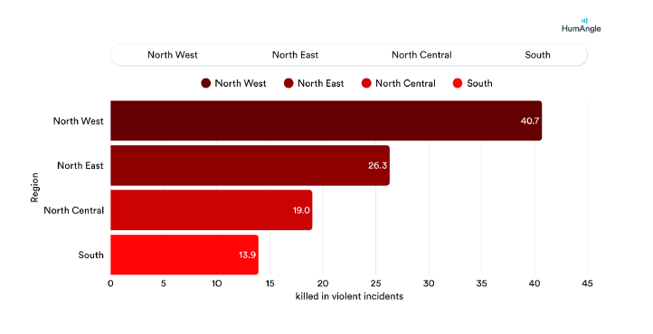 In 2024, according to the Armed Conflict Location & Event Data Project (ACLED), about 9,662 people were killed in violent incidents nationwide. Of these, about 86 per cent died in the northern part of the country, which is divided into regions with the following percentages: North West, 41.0 per cent; North East, 25.9 per cent; North Central, 19.3 per cent; and southern states, 13.8 per cent.