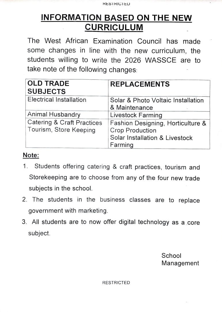 A Lagos school has abruptly communicated new subject offerings for the 2026 West African Senior Secondary Certificate Examination (WASSCE), causing panic among students already in class 3.