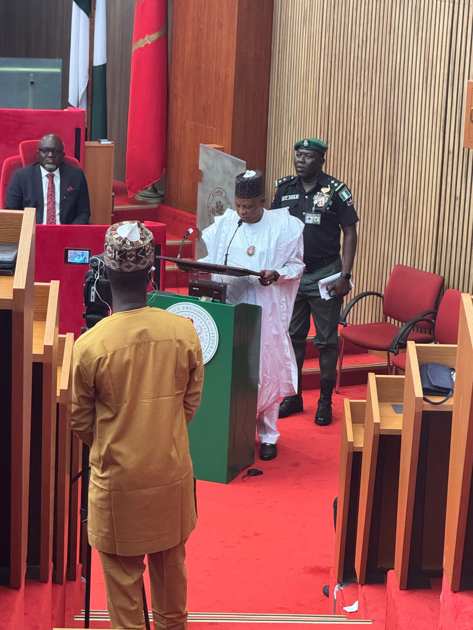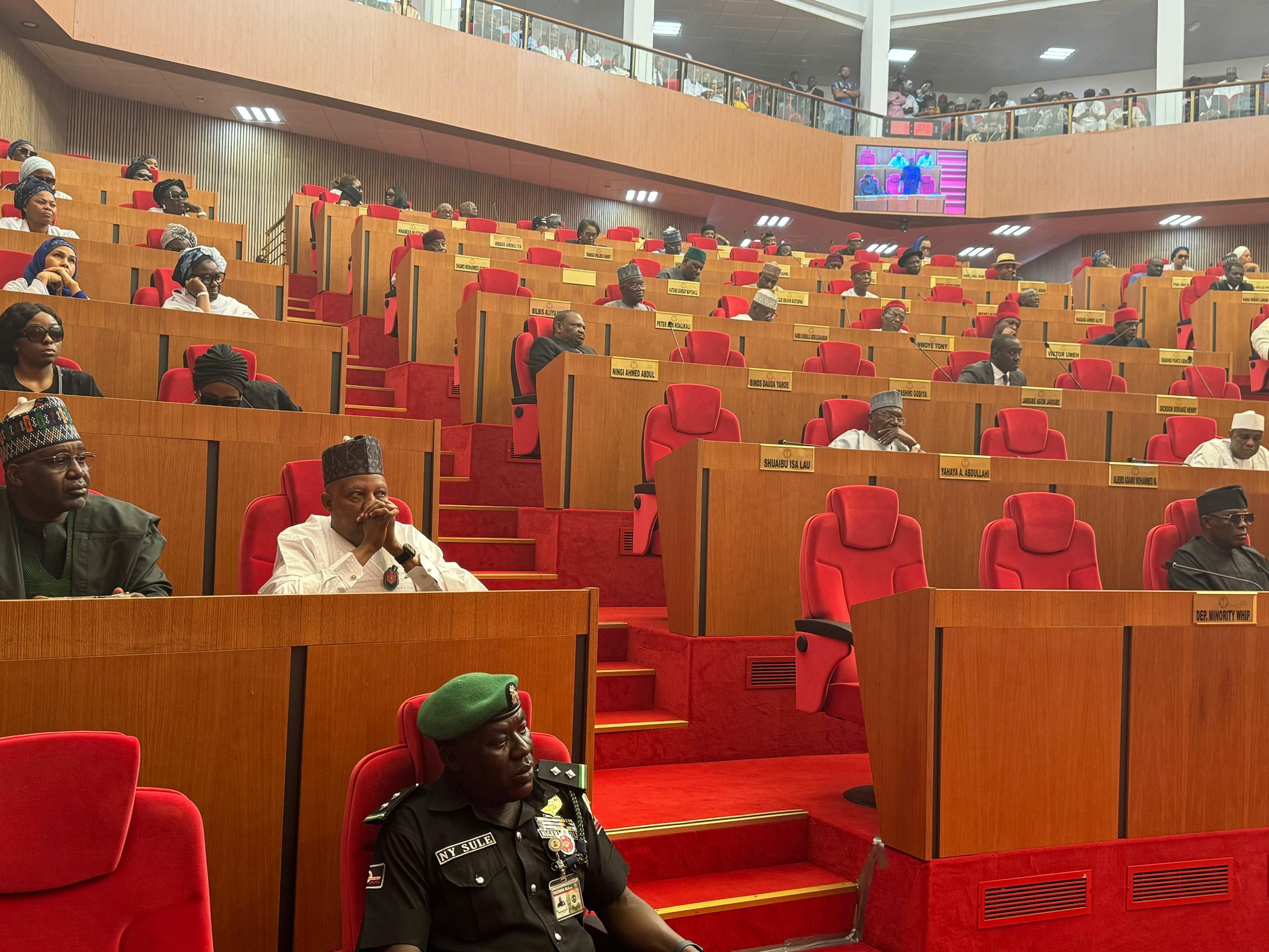 Ubah’s seat in the chamber was adorned with flowers and decorated with a cloth painted in the colours of the Nigerian flag.