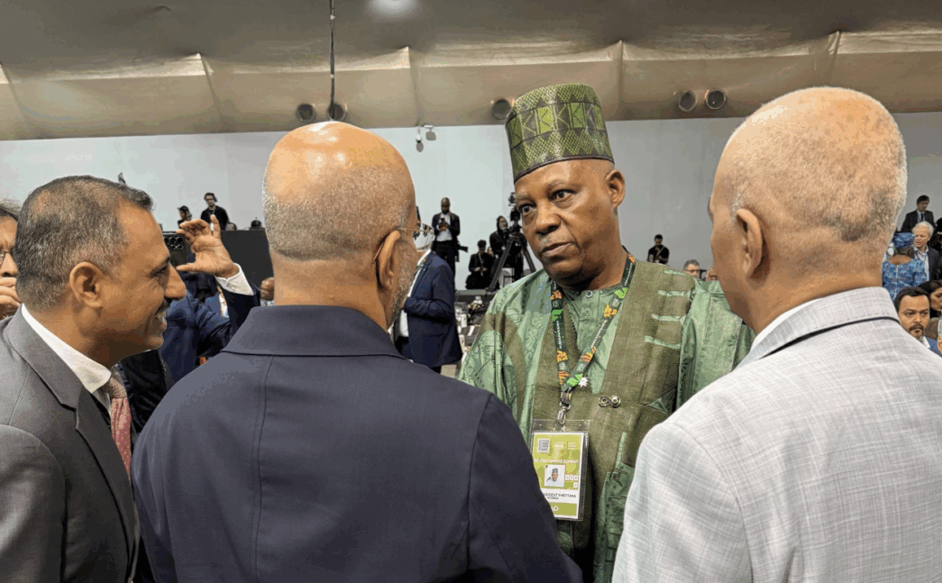 VP Kashim Shettima (M) wearing green attire interacting with world leaders at the opening of the Leaders’ Climate Summit (COP30) in Belém, Brazil