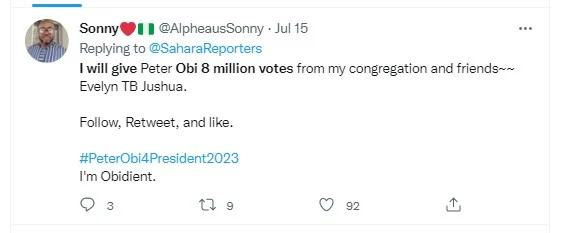 “Zan baiwa Peter Obi kuri’u miliyan 8 daga cocina. Ban taba amincewa da kowane dan takara na siyasa ba. Amma Peter Obi ya fi dan takarar siyasa. Wani yunkuri ne a karkashin wanene Najeriya za ta sake zama mai girma,” in ji taken da aka maimaita a Facebook.