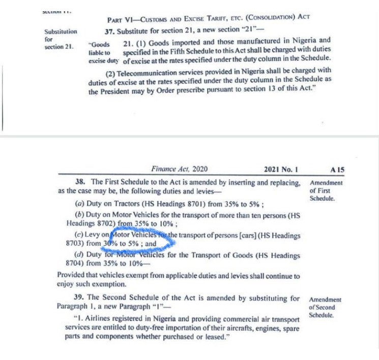 Contrary to the content of the signed finance bill, Zainab Ahmed, minister of finance, budget and national planning in an interview with ChannelsTV on January 22, 2021, said the import levy of cars was reduced from 35% to 5%.