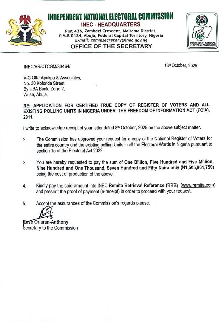 According to the letter, Otaokpukpu wrote to the commission on October 8, requesting certified true copies of register of voters and all existing polling units in all electoral wards in Nigeria.