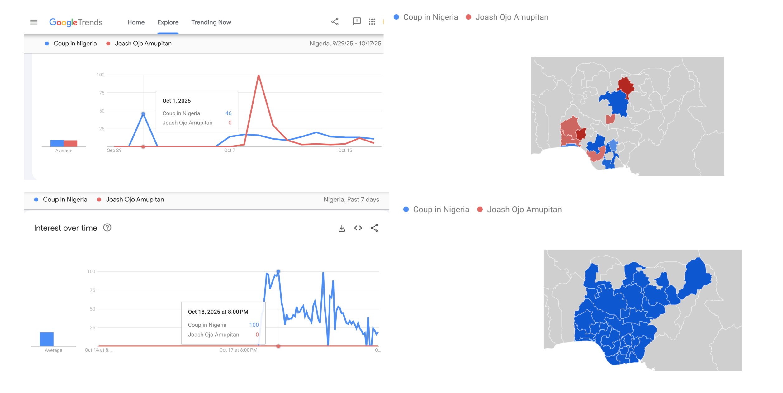 When the news about the coup became a public conversation on October 18, I decided to look under the hood and see if there was anything real time data from Google Trends could tell me about the rumours. Apparently, there was a spike on October 1, 2025, with Nigerians asking two questions about: 1) First coup in Nigeria and 2) Military coup in Nigeria.