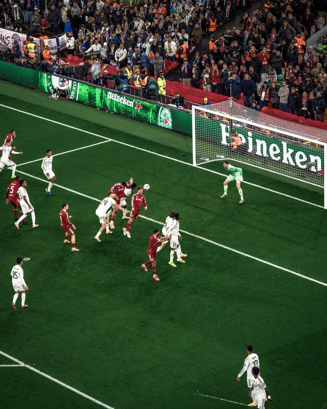 Alexis Mac Allister heads the ball past Thibaut Courtois to seal Liverpool's victory over Real Madrid| Photo Credit: Liverpool/X