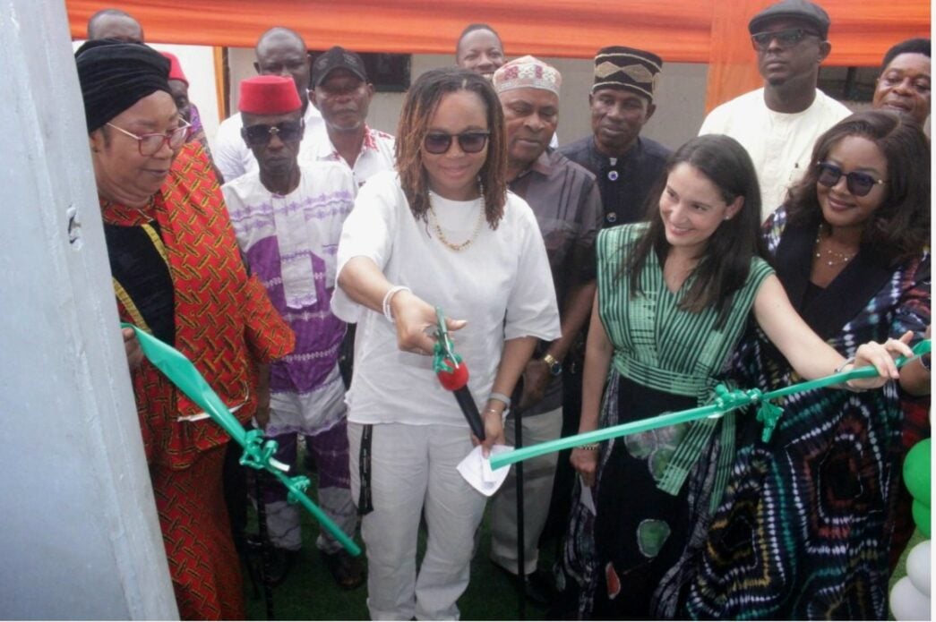 L-R: Onne Community Women representative, Chief Mrs. Dorathy Casca-Ogosu; Secretary of Onne Council of Chiefs, Chief Sunday Osaronu; Head of Procurement, APM Terminals Nigeria, Chinyere Adenaike; the representative of the Paramount Ruler of Onne, Chief Godwin Ololuka; the representative of the Managing Director, WACT-APM Terminals Nigeria, Daniella Silva; the Councillor representing Onne Ward, Eleme LGA, Rivers State, Hon. Godspower Ndor and WACT-APM Terminals Nigeria People Business Partner, Chinelo Obienyem at the ribbon cutting of the Solar powered plastic recycling plant in Onne, Eleme L.G.A, Rivers State on Monday