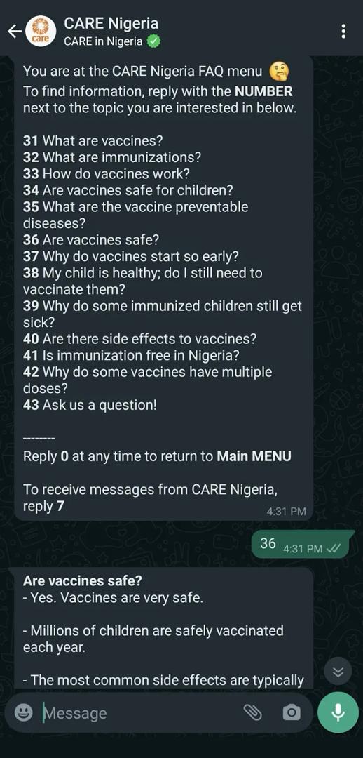 Within seconds, her phone opened a chat window. “Welcome to CARE Nigeria Chatbot. Here, you can learn about CARE Nigeria and vaccinations”, the first message read.
